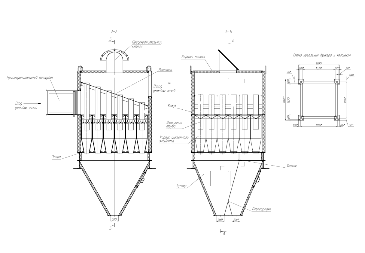 Батарейные циклоны БЦ-254-2-6x(4+2) — это ряд параллельно расположенных циклонных элементов в общем стальном корпусе с общим двухкамерным бункером. Количество циклонных элементов, расположенных в корпусе, определяется производительностью. Обычно это 20-56 элементов диаметром 254 мм. Каждый из них имеет две параллельно функционирующие секции с предохранительными клапанами, которые защищают устройство от повреждений на случай взрыва. Если нагрузка на циклон недостаточно высокая, при помощи шибера можно отключить одну из камер и циклон будет работать в половину своих возможностей.